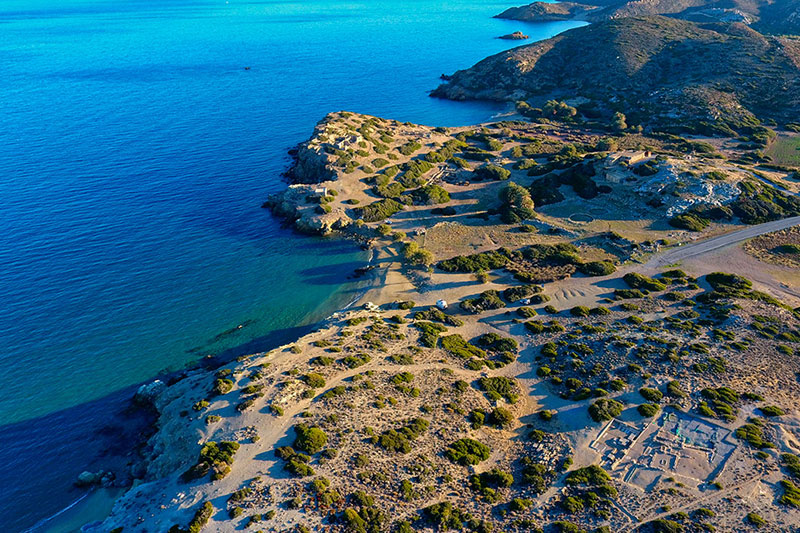 It consits of three small picturesque beaches. The ruins of the ancient city of Itanos can be found here, part of which is sunk in the sea. It is a lee area, 9 km from Palaikastro.